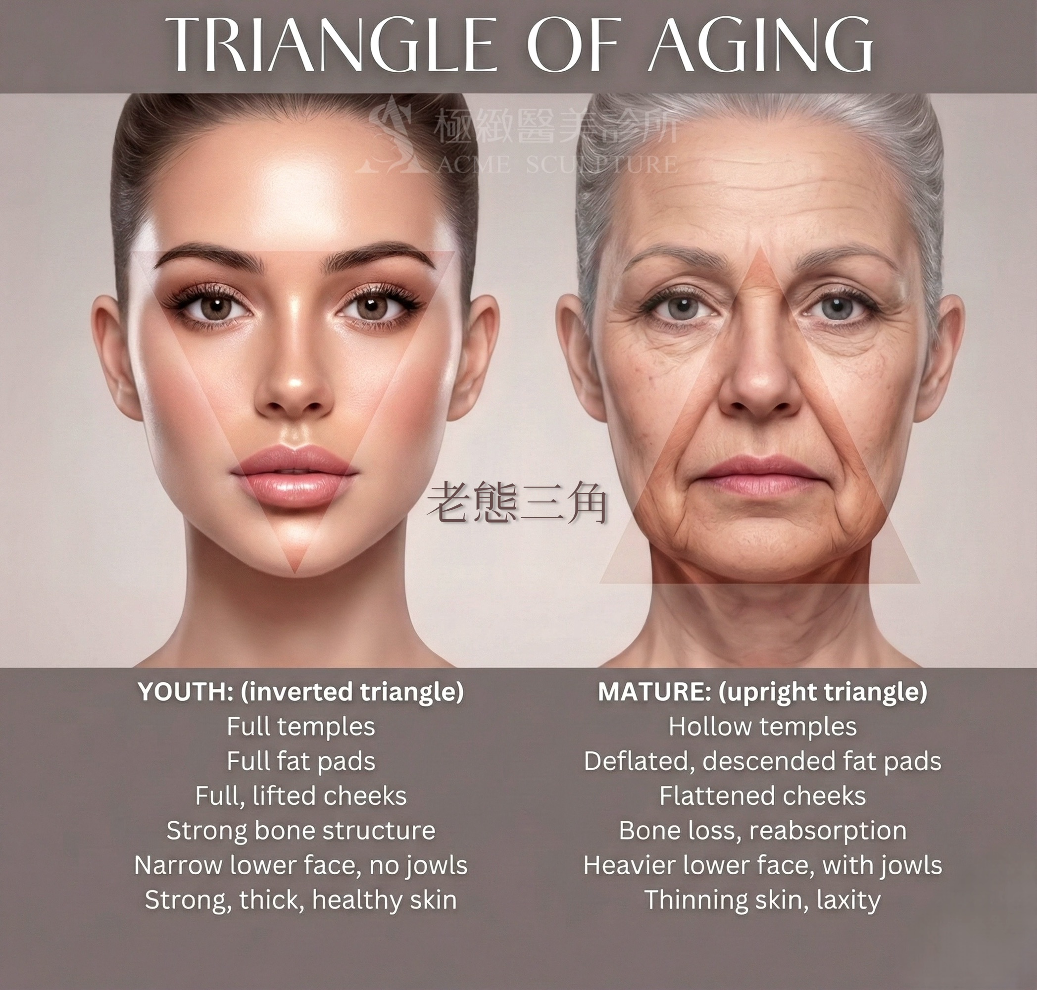 但臉部卻出現了明顯的「老態三角」的狀況 ( 如上圖示意) 中臉已產生鬆弛脫垂,臉頰重心往下呈現正三角形態,